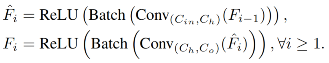 UNet块包括两个卷积神经网络(Conv),然后是批归一化函数和修正线性单元ReLU激活函数。UNet块的结构可以表示为:
