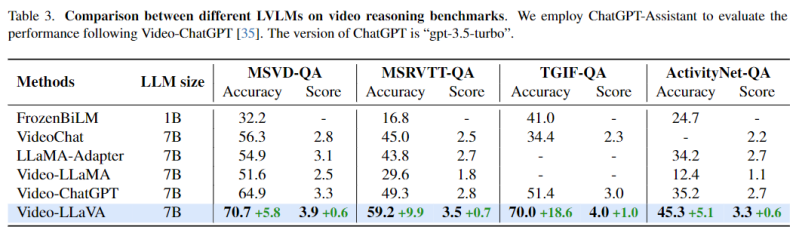 视频理解能力实验。如表3所示,Video-LLaVA在4个视频问答数据集上全面超过了Video-ChatGPT,并且涨幅相当可观。