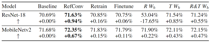 基线模型是 ResNet-18 和 MobileNetv2。应注意这些方法的推理模型都与基线模型相同。实验结果如下图4所示,权重重参数化方法旨在加速和稳定训练,带来的性能上的改进微不足道。结构重参数化方法虽然性能带来了改进,但是引入了较大的额外训练成本。相比之下,RefConv 带来的性能改进最大,且几乎没有额外的训练成本,证明了方法的优越性。