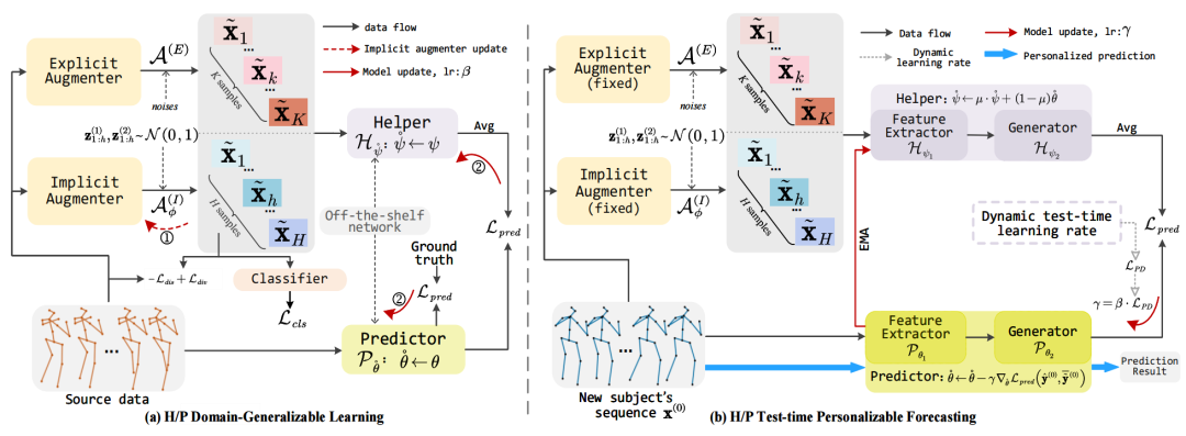 为了解决这一挑战,我们提出一种名为 “Helper-Predictor” 测试时间个性化的新方法(即 H/P-TTP),用于部署各种未知人物/未知动作样本的 3D 人体运动预测。H/P-TTP 根据各种未知主体的特征获得定制的参数,实现领域通用学习,以获得更真实的预测。具体而言,Helper-Predictor 由显式和隐式增强器组成,前者产生噪声序列以提高鲁棒性,后者采用对抗学习范式生成新领域数据。辅助模型通过增强器处理源之外的样本,获取跨主体的不变上下文,并将这些知识传递给预测模型进行更新。预测模型在测试过程中可以进一步更新,以适应未知的测试对象。
