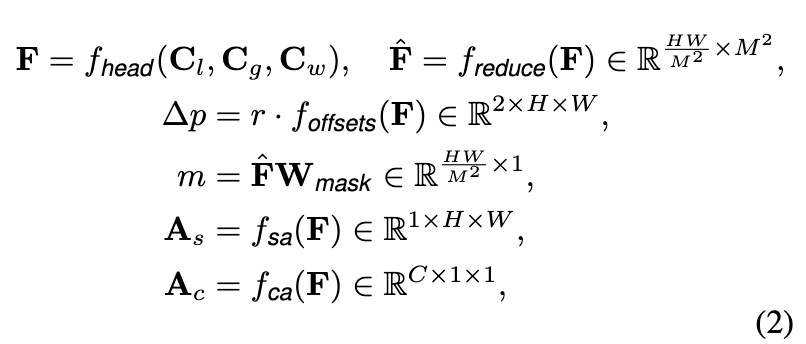 其中, 是用于warp具有更复杂结构的窗口的与内容相关的偏移矩阵。 是一个标量, 用于控制偏移量的范围。 是根据注意力窗口大小 减少并重新排列的中间特征。 是决定裁剪窗口是否由注意力还是卷积计算的mask。 和 是用于增强卷积分支的空间和通道注意力。