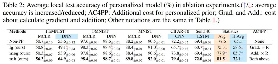 主要摘掉了个性化先验策略的混合方法的本地似然梯度、本地包络梯度以及两者同时摘除,即退化成pFedMe【高斯先验假设的一种pFedBreD,用L2正则作为正则项。其他的方法也是pFedBreD框架下支持的方法,比如:KL正则,一些变分推断的方法】。消融实验体现了个性化先验方向的潜力,以及方法的各种信息补偿方式的有效性。