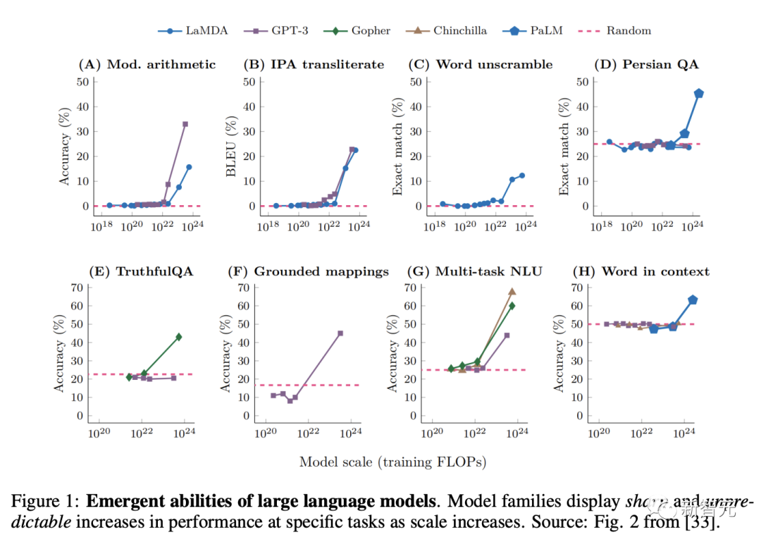大模型涌现能力有着极大吸引力,主要有两方面的原因:一是其敏锐性,从不曾出现到出现似乎是瞬间完成的;二是其不可预测性,出现在似乎无法预见的模型尺度上。