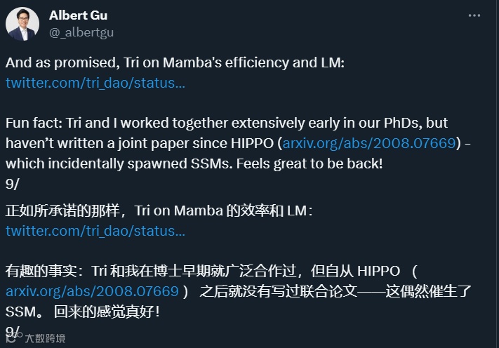 Tri Dao 则是 FlashAttention、Flash Attention v2、Flash-Decoding的作者。FlashAttention 是一种对注意力计算进行重新排序并利用经典技术(平铺、重新计算)加快速度并将内存使用从序列长度的二次减少到线性的算法。Flash Attention v2、Flash-Decoding 都是建立在 Flash Attention 基础上的后续工作,把大模型的长文本推理效率不断推向极限。在 Mamba 之前,Tri Dao 和 Albert Gu 也有过合作。