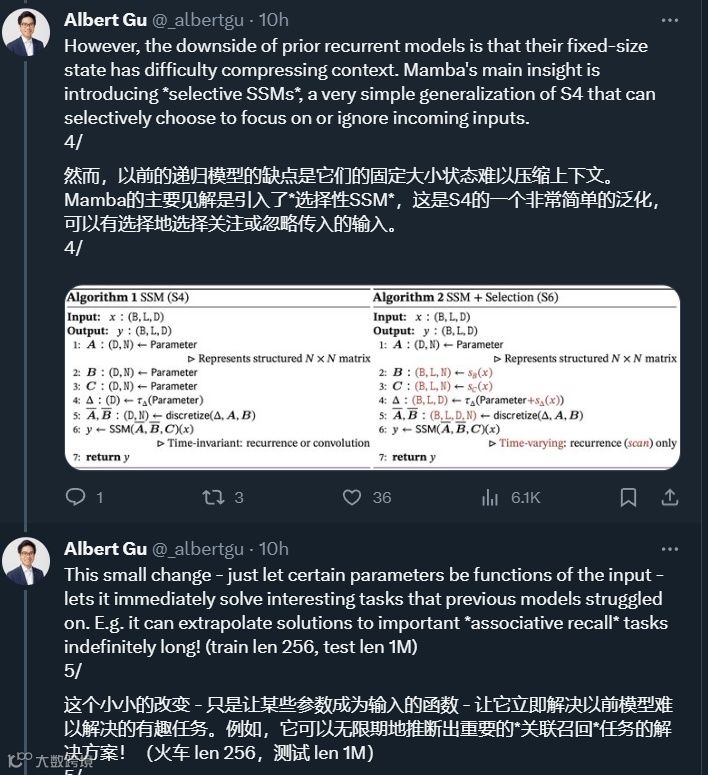 Albert Gu 表示,这项研究的一个重要创新是引入了一个名为「选择性 SSM」的架构,该架构是 Albert Gu 此前主导研发的 S4 架构(Structured State Spaces for Sequence Modeling ,用于序列建模的结构化状态空间)的一个简单泛化,可以有选择地决定关注还是忽略传入的输入。一个「小小的改变」—— 让某些参数成为输入的函数,结果却非常有效。