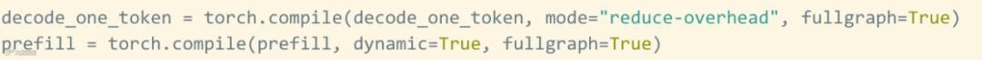 torch.compile 允许用户将更大的区域捕获到单个编译区域中,特别是在 mode=”reduce-overhead” 时(参考下面的代码),这一功能对于减少 CPU 开销非常有效,除此以外,本文还指定 fullgraph=True,用来验证模型中没有「图形中断」(即 torch.compile 无法编译的部分)。