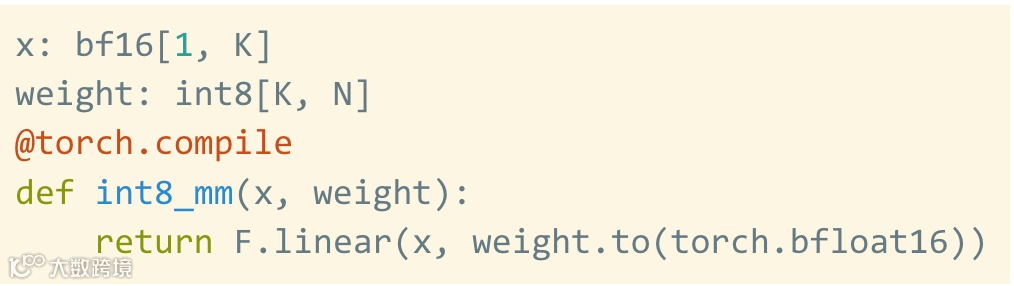 请注意,这仅是量化权重,计算本身仍然在 bf16 中完成。此外,有了 torch.compile,可以轻松生成 int8 量化的高效代码。