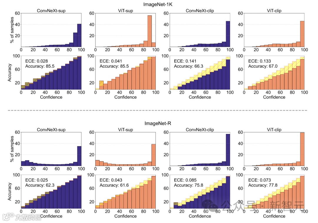 研究人员在ImageNet-1K和ImageNet-R上对校准进行了评估,将预测分为15个等级。在实验中,观察到以下几点:
