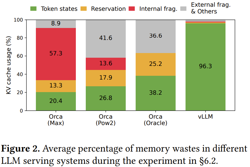事实上,我们可以在图 2 的分析中看到,在现有系统中,仅有 20.4%-38.2% 的 KV 缓存内存会用于存储实际的 token 状态。
