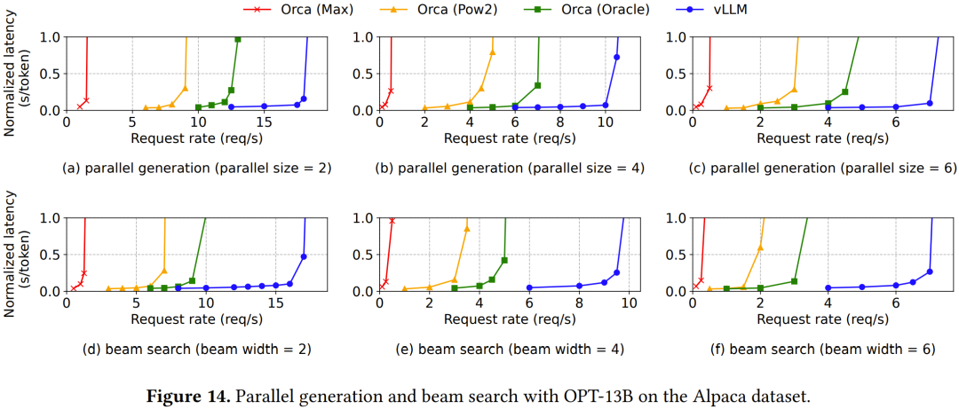 如图 14 上面一行所示,如果要采样的序列数量很多,则 vLLM 能在 Orca 基准的基础上带来更大的提升。