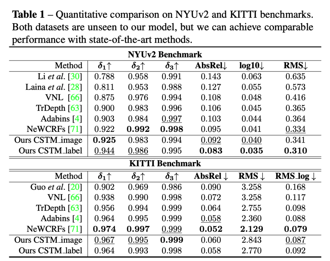 以下的几个表格都是做的零样本泛化实验。其中表格1中,在NYU和KITTI上和当前在他们上fitting的SOTA方法做了对比,发现在不引入该数据做训练,模型就能够恢复出精确的尺度。表格3,论文做了更多的这种零样本泛化的对比,比较了6个数据集。