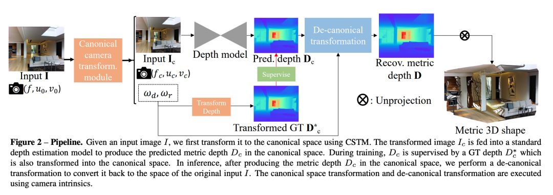 提出了一种标准空间相机变换(canonical camera space transformation)和对应的逆变换(de-canonical camera space transformation)方法来解决来自不同相机设置的深度尺度模糊性问题。这使得论文方法可以从大规模数据集中学习强大的零样本(zero-shot)单目度量深度模型; -