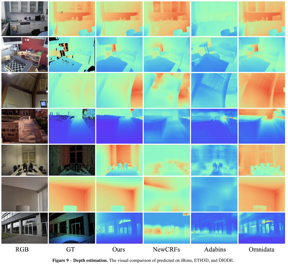 另外,论文与SOTA仿射不变深度估计方法在5个zero-shot基准上的比较。论文的模型明显优于以前的方法