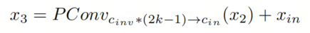 接下来,类似于Transformer,作者在卷积块中包括了一个Shortcut连接,以便更好地传播梯度。因此,作者进行另一次点卷积,将通道数减少到cin并与输入特征图相加。因此, 变成了 (图2b)。