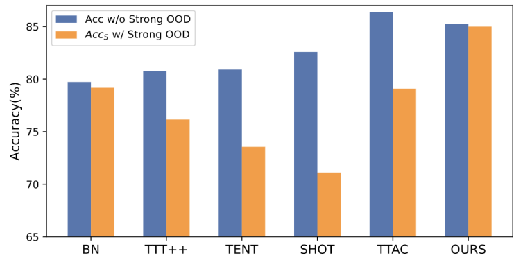 基于自训练的 TTT 很难处理强 OOD 样本,因为它必须将测试样本分配给已知的类别。尽管可以通过应用半监督学习中采用的阈值来过滤掉一些低置信度样本,但仍然不能保证滤除所有强 OOD 样本。