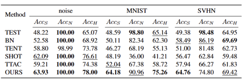 我们在 5 个不同的 OWTTT 基准数据集中进行测试,包括人工合成的损坏数据集和风格变化的数据集。实验主要使用了三个评价指标:弱 OOD 分类准确率 ACCS、强 OOD 分类准确率 ACCN 和二者的调和平均数 ACCH。