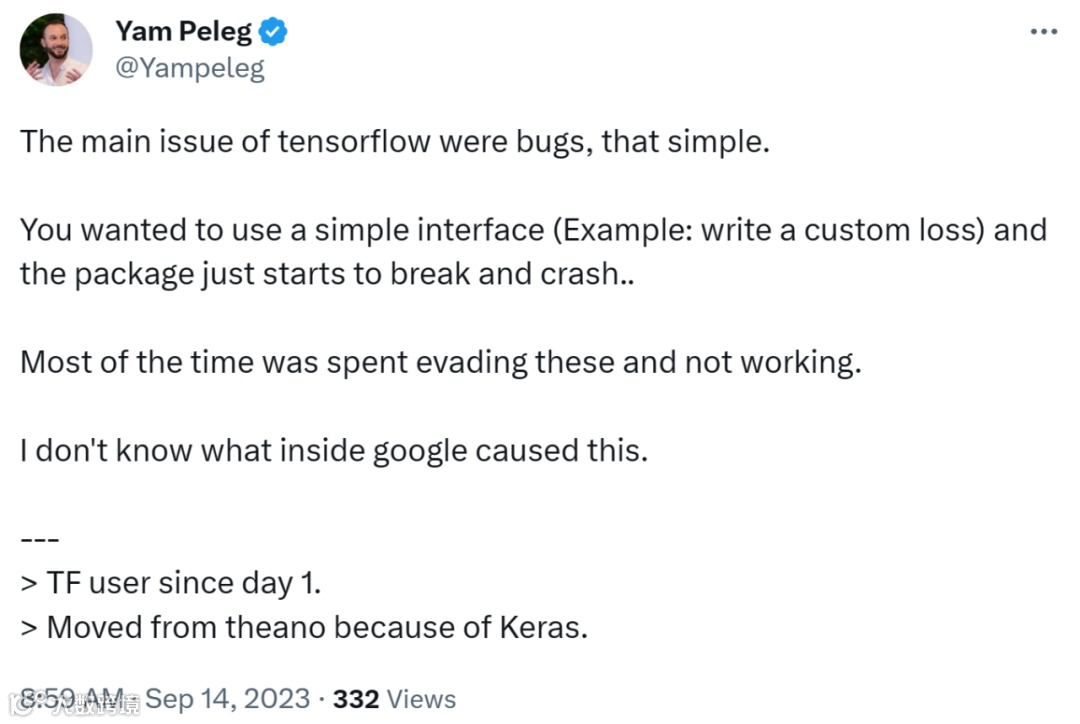 著名软件开发者、Deep trading 创始人 Yam Peleg 表示,TensorFlow 的主要问题在于 bug。当你想使用一个简单的界面(如编写自定义损失)时,包不一会就损坏和崩溃了。因此不得不将大多数时间花在如何回避这些 bug 而不是工作上。