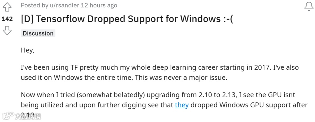 帖子作者表示自 2017 年开始,整个深度学习生涯几乎都在使用 TensorFlow,并一直在 Windows 系统上使用。但当从 2.10 升级到 2.13 版本时,他发现 GPU 没有被利用上,深挖之后发现 TensorFlow 在 2.10 版本之后就放弃了对 Windows GPU 的支持。