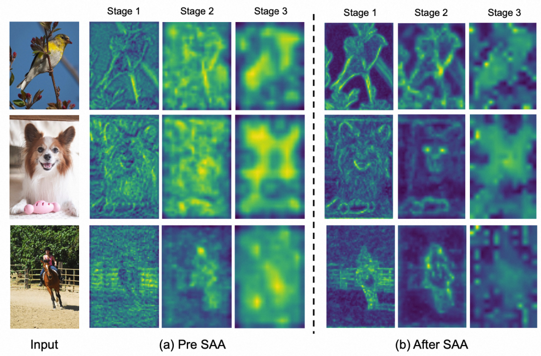 如图3所示,我们可视化出SAA前和SAA后的特征图,可以观察到SAA模块加强了语义相关的低频信号,并准确地聚焦于目标物体最重要的部分。与聚合之前的卷积映射相比,SAA模块展示了更好的能力来捕捉和表示视觉识别任务的关键特征。