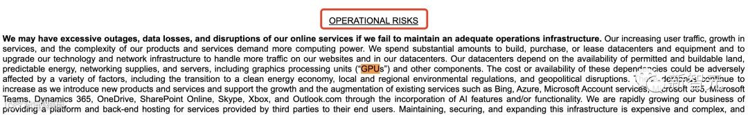上周,微软发布了年度报告,并向投资者强调,GPU是其云业务快速增长的「关键原材料」。如果无法获得所需的基础设施,可能会出现数据中心中断的风险因素。