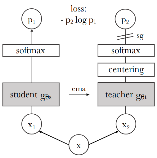 DINO 算法如下图2所示。知识蒸馏是一种学生网络 匹配给定教师网络 的学习范式,其参数分别是 和 。给定输入图片 ,两个网络都输出 维上的概率分布,用 和 表示。概率 是通过使用 Softmax 函数对网络 的输出进行归一化来获得的: