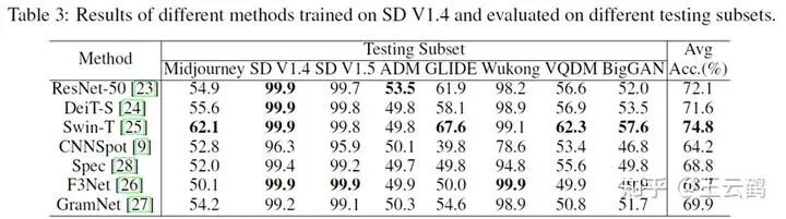 我们对比了现有方法在Stable Diffusion V1.4上训练,然后在各种生成器上测试的结果,见图3。我们也评测了各种生成器上训练,然后在各种生成器上测试的结果。见图4。图4中,Testing Subset那一列中的每一个数据点,都是在八个生成器上训练,然后在一个生成器上测试得到的平均结果。然后我们将这些测试集上的结果平均,得到最右侧的平均结果。