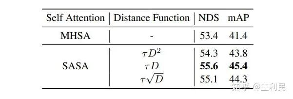相比于标准的 MHSA,SASA 几乎没有引入额外开销,简单又有效。在消融实验中,使用 SASA 替换 MHSA 能直接暴涨 4.0 mAP 和 2.2 NDS:
