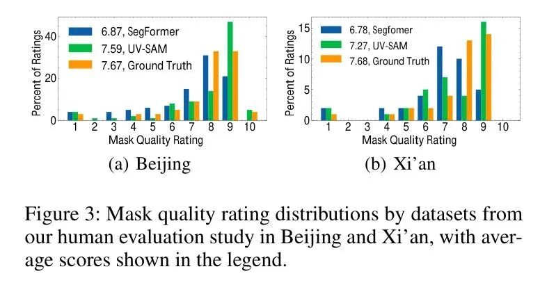 结果表明,UV-SAM在两个数据集上都优于SegFormer,实现了更好的Mask质量。 例如,在Beijing数据集上,UV-SAM的平均评分达到7.59,而SegFormer为6.87,与 GT 数据7.67相比。在评分较低的范围内,UV-SAM的表现略低于 Baseline 。相反,在评分较高的范围内,UV-SAM的频率明显增加。这些结果表明SAM对于分割边界的有效性。