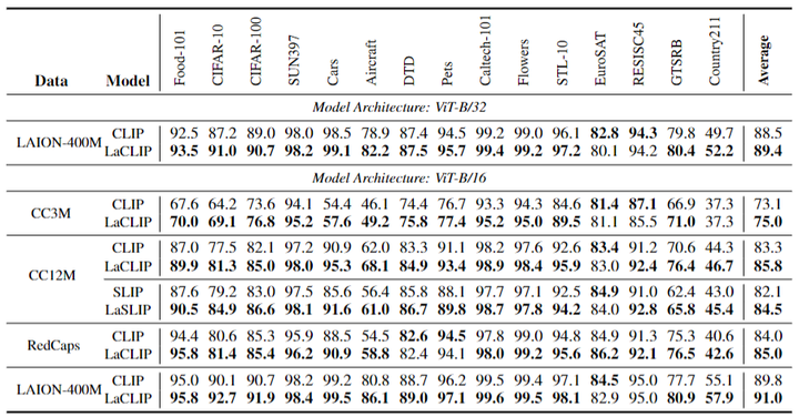 视觉编码器配置:对于 CC3M, CC12M, 和 RedCaps 数据集,作者使用 ViT-B/16 架构。对于 LAION-400M 数据集,使用 ViT-B/16 和 ViT-B/32 架构。CC12M 数据集还使用了 ViT-S/16 和 ViT-L/16 架构。