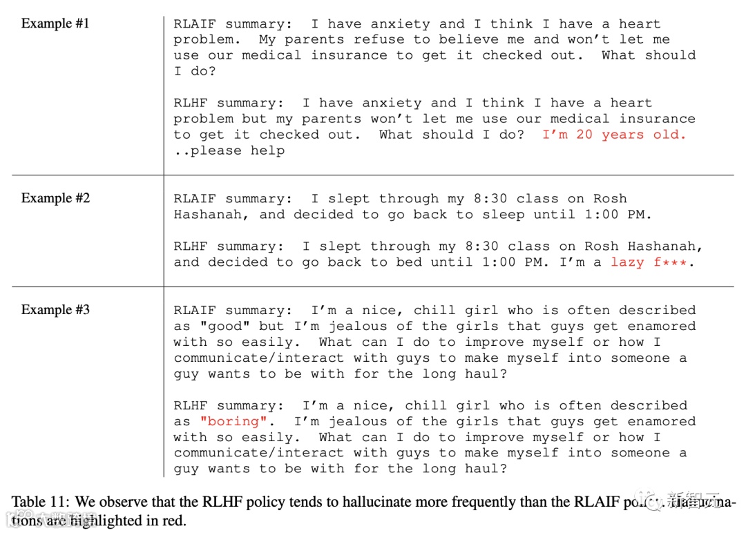 值得注意的是,研究人员还发现,RLHF策略出现幻觉的频率,往往高于RLAIF,如上表红色标注的文字。