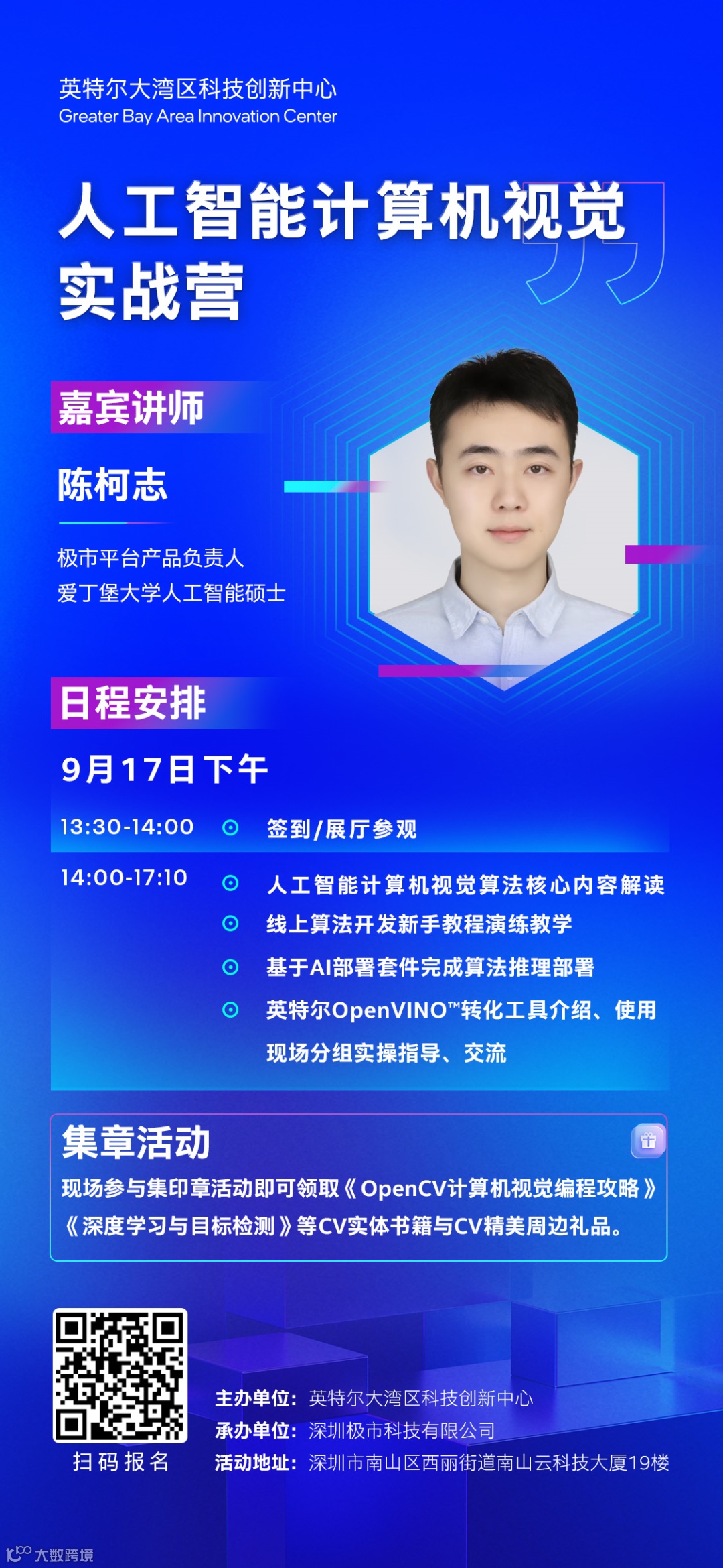 本次课程聚焦计算机视觉算法开发,特邀极市平台产品负责人陈柯志主讲人工智能计算机核心技术原理,并带领学员进行现场实训。手把手演示目标检测项目的算法开发流程,过程中将借助英特尔OpenVINO™转化套件、AI部署套件来进行实操和推理部署,帮助开发者加速算法的开发,让算法落地更加简单。
