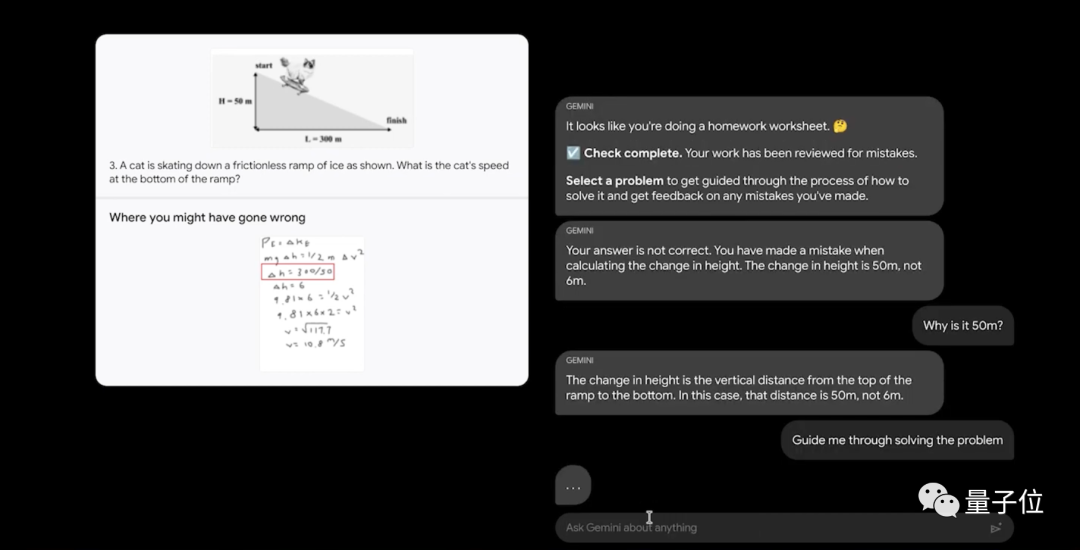 例如“喂”给Gemini一张手写物理题,它不仅能看懂,而且还可以辨别手写答案的对错。