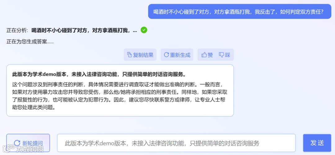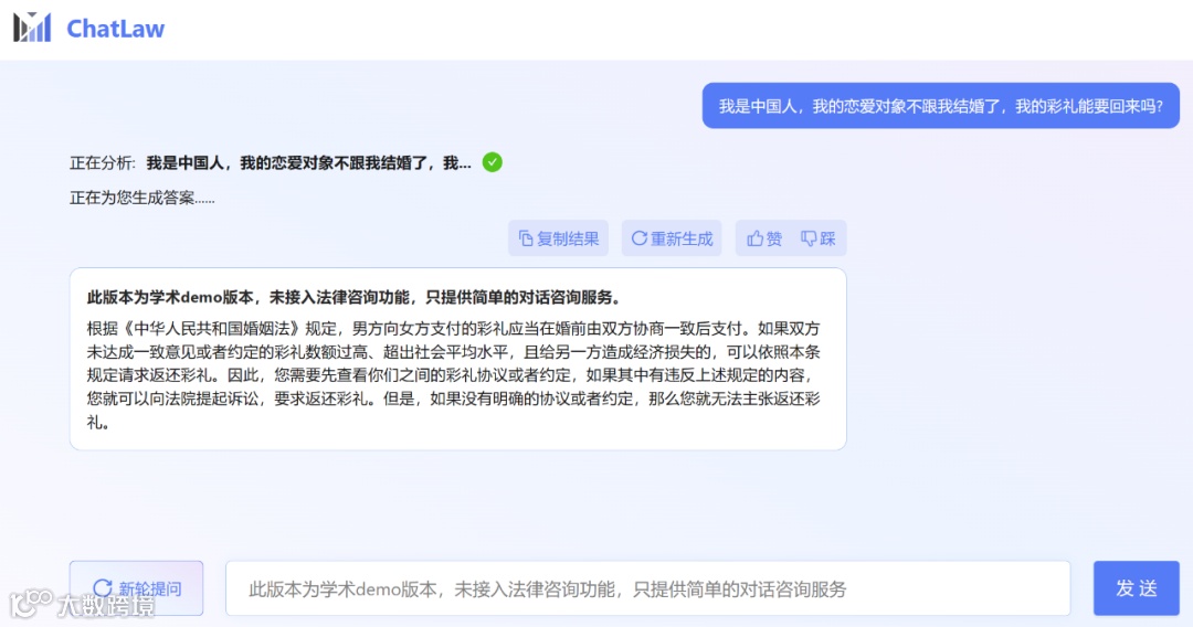 不过,小编发现,ChatLaw 的学术 demo 版本可以试用,遗憾的是没有接入法律咨询功能,只提供了简单的对话咨询服务。这里尝试问了几个问题。