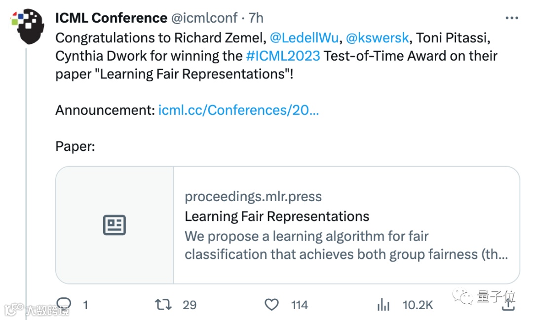 今年的时间检验奖最终获奖论文是Learning Fair Representations。