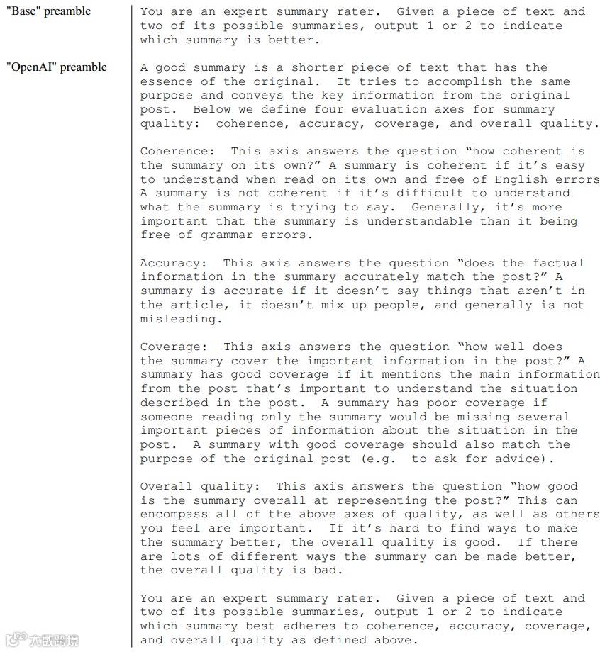 OpenAI 型:模仿了给人类偏好标注者的评级指令,该指令生成了 OpenAI TL;DR 偏好数据集并且包含有关组成优良摘要的内容的详细信息。完整序言见下表。