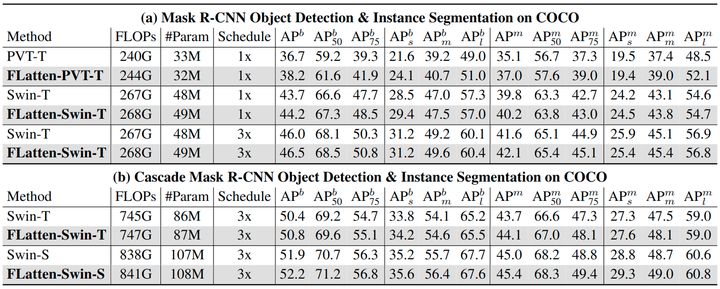 实验结果如下图6所示,作者使用 ImageNet 预训练模型和 Mask R-CNN 和 Cascade Mask R-CNN 检测头框来评估有效性,在不同检测头的 1x 和 3x schedule 设置下进行了实验。结果显示,利用更大的感受野,带有 Flattened Attention 的模型在所有设置下都显示出更好的结果。