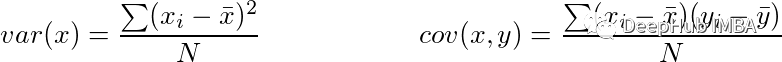 协方差量化了两组有序数据中对应元素相似的程度。用cov(x, y)表示变量x和y之间的协方差。xi表示第i维中x的值,而x柱和y柱表示它们各自的平均值。如果我们有一个维数为m*n的矩阵X,其中包含n个数据点,每个数据点有m维,那么协方差矩阵可以计算如下: