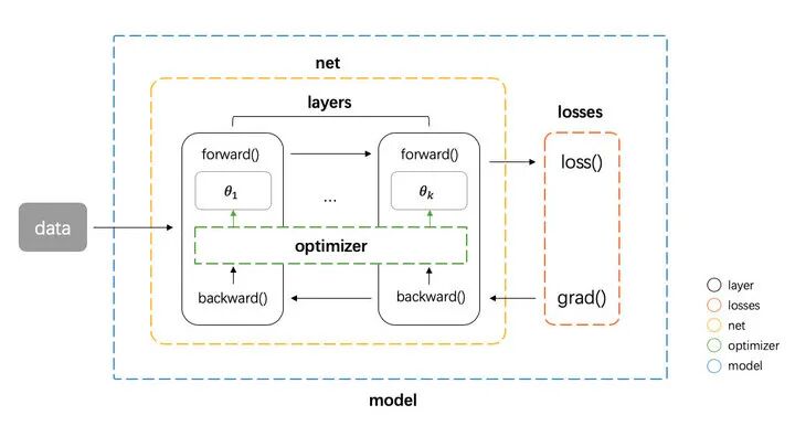 model 组件负责整合所有组件,形成整个 pipeline。即 net 组件进行前向传播 -> losses 组件计算损失和梯度 -> net 组件将梯度反向传播 -> optimizer 组件将梯度更新到参数。