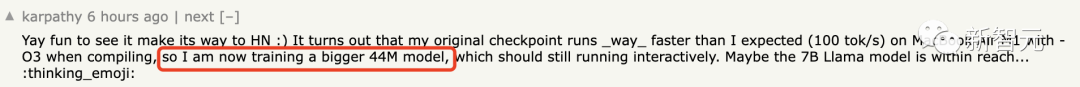 事实证明,我原来的检查点用编译-O3在MacBook Air M1上运行_way_(100 tok/s)的速度比我预期的要快,所以我现在正在训练一个更大的44M模型,它应该仍然以交互方式运行。也许7B Llama模型触手可及。