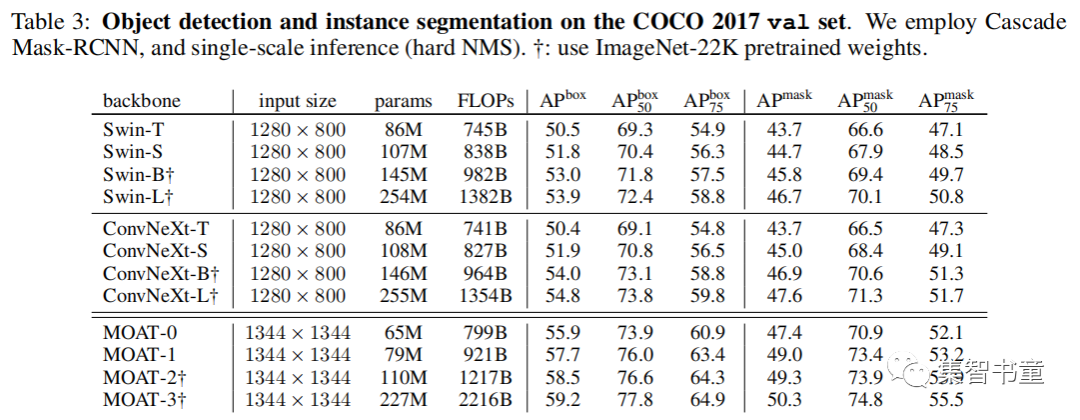 此外,通过简单地将全局注意力转换为非重叠的局部窗口注意力,MOAT可以无缝部署到需要大分辨率输入的下游任务。由于MBConv可以有效地在像素之间交换局部信息(支持跨窗口传播),MOAT不需要额外的窗口移动机制。因此,在COCO目标检测和ADE20K语义分割方面,MOAT表现出了优异的性能。具体而言,在COCO目标检测方面,最佳模型(227M参数)通过单尺度推理和Hard-NMS实现了59.2%的,在使用casde mask R-CNN的模型大小200M的范围内创造了新的技术水平。在ADE20K语义分割方面,采用DeepLabv3+的最佳模型(496M参数)通过单尺度推理获得57.6%的mIoU,也在使用输入大小641×641的模型体系中创造了新的技术水平。