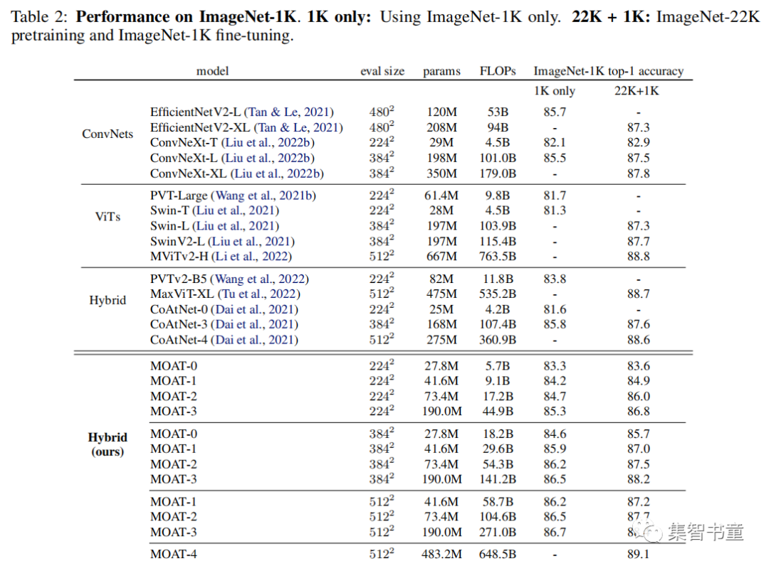 MOAT,一个建立在Mobile Convolution(即inverted residual blocks)和注意力之上的神经网络家族。与当前将Mobile Convolution和Transformer Block分开堆叠的工作不同,作者将二者有效地合并到MOAT Block中。