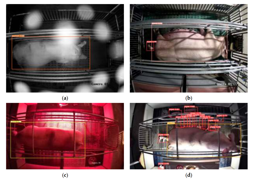 接下来,对数据进行预处理。实验团队首先筛选出母猪分娩前后一天录制的视频,然后用 Python 和 OpenCV 将其处理成图像数据。利用标签软件对获取的 12,450 张图像中的母猪姿势及新生仔猪数据进行手动标注和数据增强,得到 32,541 张图像数据组成数据集。