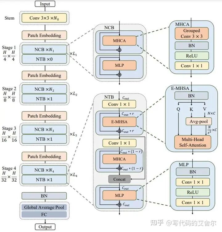 只需从Architecture Overview中我们就能发现他们的端倪:熟悉的conv+relu+bn,逐级降采样。这类模型还是保留了CNN架构的典型特点,只有头部和躯干部分植入了Transformer单元。