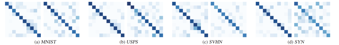 域间分析。表 6 报告了不同方法的域间性能。在域偏移的情况下,SOLO 在这两个任务中表现得最差。我们观察到,FCCL 的表现明显优于其他同类方法。图 10 显示,FCCL 在参与者之间实现了相似的 logits 输出,并在 logits 输出中实现了冗余,这证实了 FCCL 在公共和私有数据上成功地执行了相同维度的相关性和不同维度的去相关性。