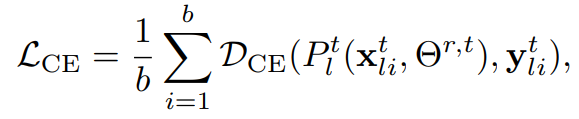 其中,b 是批次大小,Θ_r,t 是第 r 轮全局任务的分类模型,由中央服务器传送给本地客户端。P^t_l (x_t^(l_i, Θ_r,t) ∈R^(C^p+C^t)表示通过 Θ_r,t 预测的 sigmoid 概率,DCE (・,・) 是二元交叉熵损失。