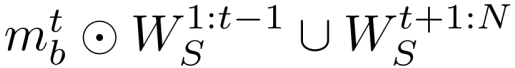 以一维卷积层中的选择性掩码的训练过程为例进行描述。在任务 t,M_g(即 W^1:N_S)是固定的。将二进制掩码表示为 m^t_b。那么,输入 - 输出关系的方程为:
