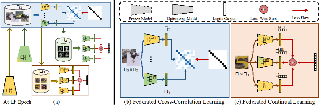 第三篇文章提出了一种联邦互相关和持续学习方法。对于异构性问题,该方法利用未标记的公共数据进行通信,并构造互相关矩阵来学习域偏移(domain shift)下的可概括性的表示。同时,对于灾难性遗忘,在本地更新中利用跨域和本域信息进行知识蒸馏,有效地提供域间和域内知识而不泄露参与者的隐私 [4]。