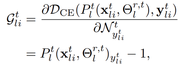 对应于此问题,本文设计了一个类别意识梯度补偿损失 L_GC,通过重新加权梯度传播,分别对新类别的学习速度和旧类别的遗忘速度进行规范。具体来说,对于单个样本(x^t_li, y^t_li),我们得到一个相对于 Θ^r,t_l 中最后输出层的第 y^t_li 个神经元的梯度测量 G^t_li: