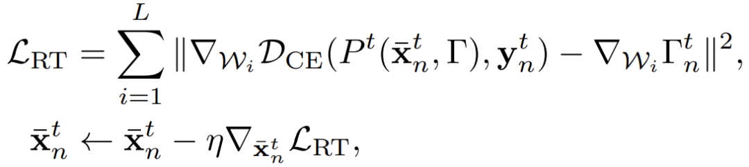 基于梯度的原型通信。给定第 l 个本地客户端 Sl∈Sb∪Sn,该客户端收到训练数据 T^t_ l 的新类,Sl 通过任务转换 detention 来识别新的类。然后 Sl 从 T^t_l 中为每个新的类(c = C^p_l + 1, - -, C^p_l +C^t_l)只选择一个有代表性的原型样本 x^t_lc∗,其中 x^t_lc∗的特征最接近属于 c 类的所有样本在潜在特征空间的平均嵌入。然后将这些原型样本和它们的标签送入 L 层梯度编码网络 Γ = {Wi},计算梯度∇Γ_lc。S_P 随机处理所有从本轮全局的选定客户端处收到的梯度,以构建一个梯度池,假设这个池子里有 N^t_g 个梯度。这种操作可以防止 S_P 通过注释特殊的梯度分布来追踪某些选定的客户端。对于∇Γ^t 的第 n 个元素∇Γ^t_n,我们可以通过观察∇Γ 中最后一层的梯度符号来获得其对应的 ground-truth 标签 y^t_n(有一个独热编码标签 y^t_n)。给定一个由标准高斯 (N0,1) 初始化的假样本 x¯^t_n,将所有的 {x¯^t_n, ∇Γ^t_n, y^t_n} 对转发到 Γ = {Wi},该网络与本地客户端使用的梯度编码网络相同,以恢复每个新类的原型样本。重建损失 L_RT 如下: