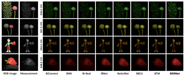 (1)提出了光谱压缩重建领域内首个基于二值神经网络(Binarized Neural Network,BNN)的算法 — 二值化光谱重分布网络(Binarized Spectral-Redistribution Network,BiSRNet)。